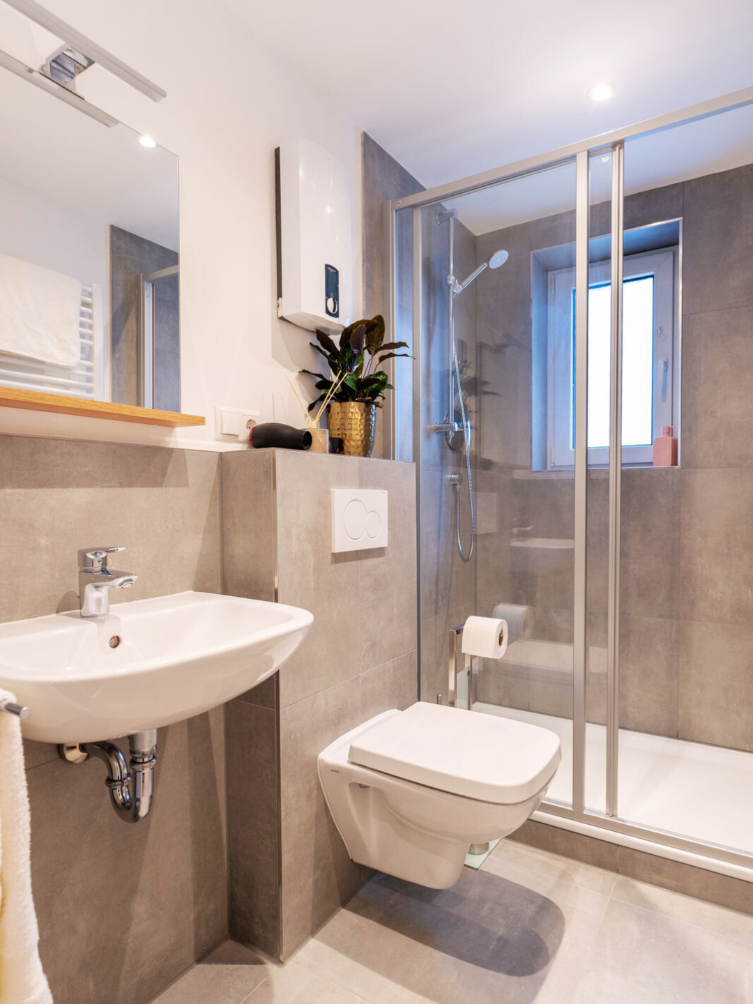 Modernes Tageslicht Bad mit Dusche, Föhn und Hygiene-Artikeln für den Start